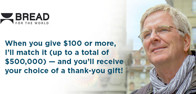 I'd love to send you a special Christmas package when you make a $100 gift to Bread for the World. Last year, 6,000 travelers joined us. And this year, I'm hoping we'll do it again! When you send your gift of $100 or more, I'll match it, and you'll receive your choice of a thank-you gift. Imagine, as an extended family of caring (and traveling) people, together we can empower Bread's work with $1,000,000.