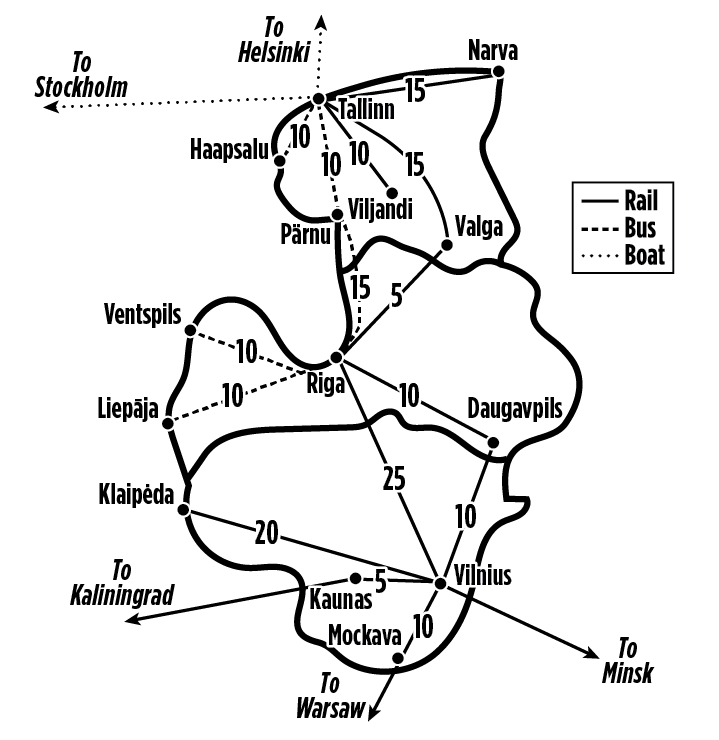 Use this map to add up approximate pay-as-you-go fares for your itinerary, and compare that cost to the price of a rail pass for the number of days you expect to spend on the train. Dotted lines show ferry routes and dashed lines (such as Tallinn–Pärnu) show bus routes, neither of which are covered by rail passes.