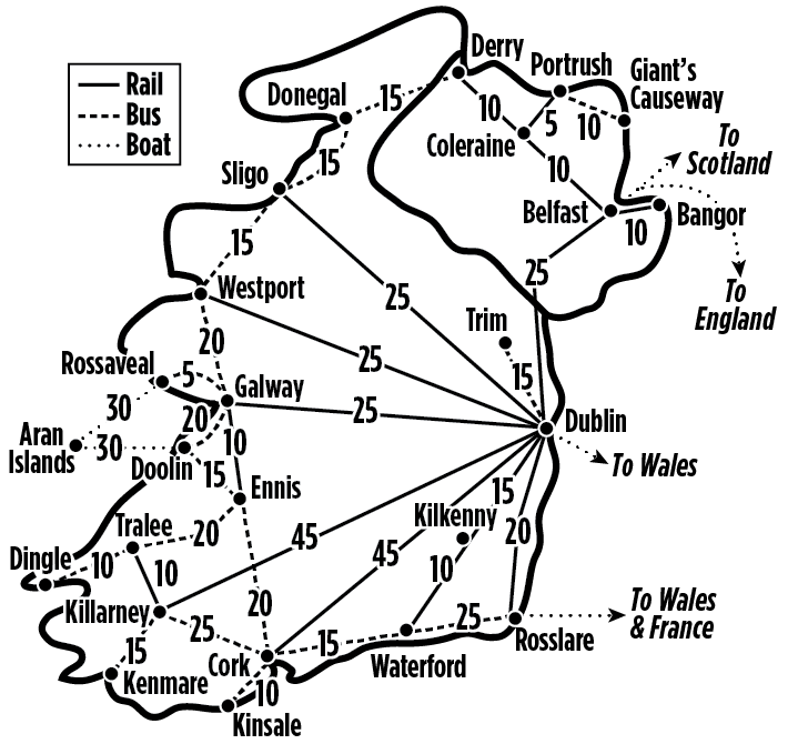 The train fares shown here for the Republic of Ireland roughly match what you'd pay if buying a ticket online shortly before departure. Dashed lines show bus connections, which aren't covered by rail passes. Dotted lines show ferry routes (rail passes get you a discount on some international ferries, but not on Aran Islands routes).