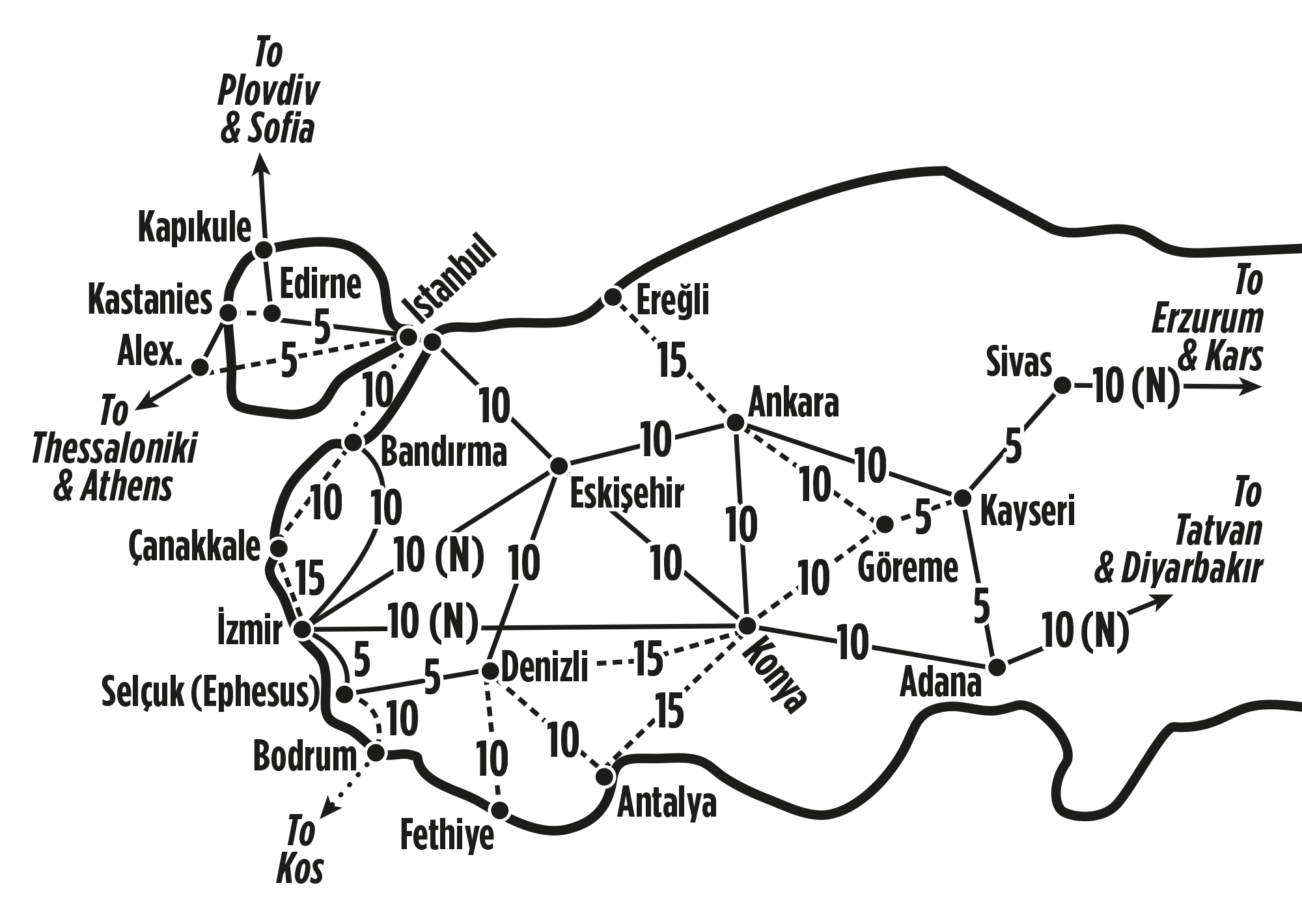 Use this map to add up approximate pay-as-you-go fares for your itinerary, and compare that cost to the price of a rail pass for the number of days you expect to spend on the train. Dotted lines (such as Istanbul–Bandırma) show ferry routes, and dashed lines show bus routes, neither of which are covered by rail passes. "(N)" indicates that a route has only an overnight train connection.