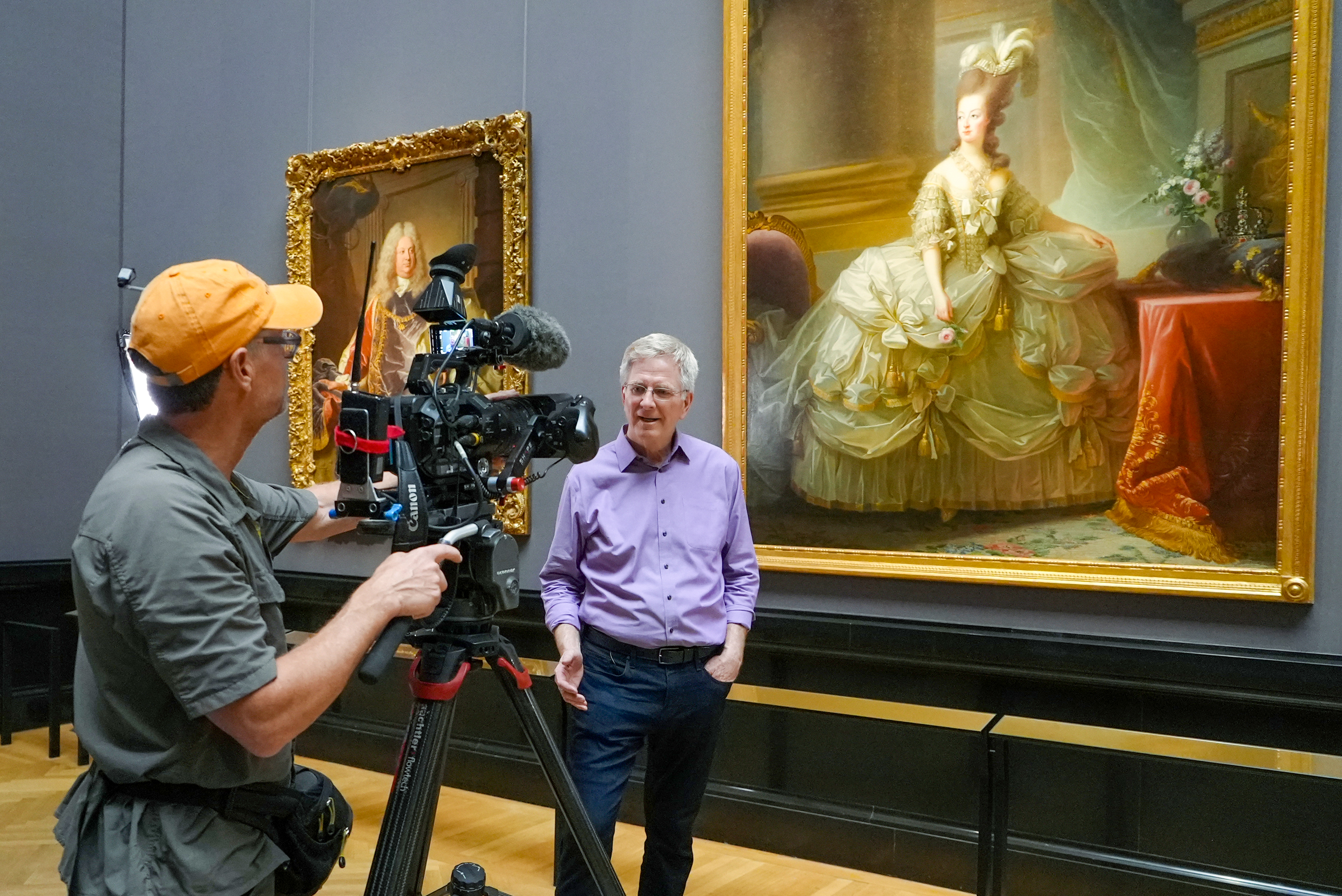 We are a small and nimble crew of three: me (the host), Simon Griffith (our producer), and Karel Bauer (our cameraman). We are all from Seattle and have worked together for over 20 years. Simon and Karel are great travelers, and each loves art. I often marvel at the blessing of having worked for decades with two professionals whom I really enjoy. After capturing an iconic masterpiece on camera, a favorite ritual for the three of us is to put the gear down and take five to simply savor the art.