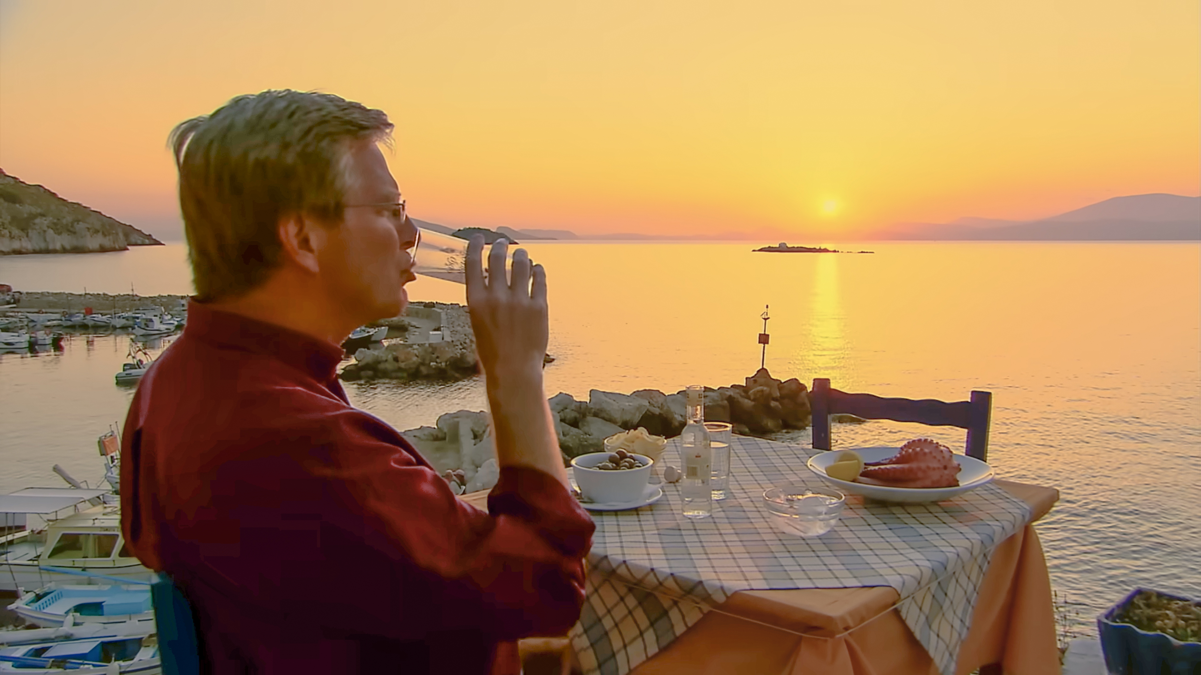 Rick sips a cloudy glass of ouzo at sunset on the Greek isle of Hydra.