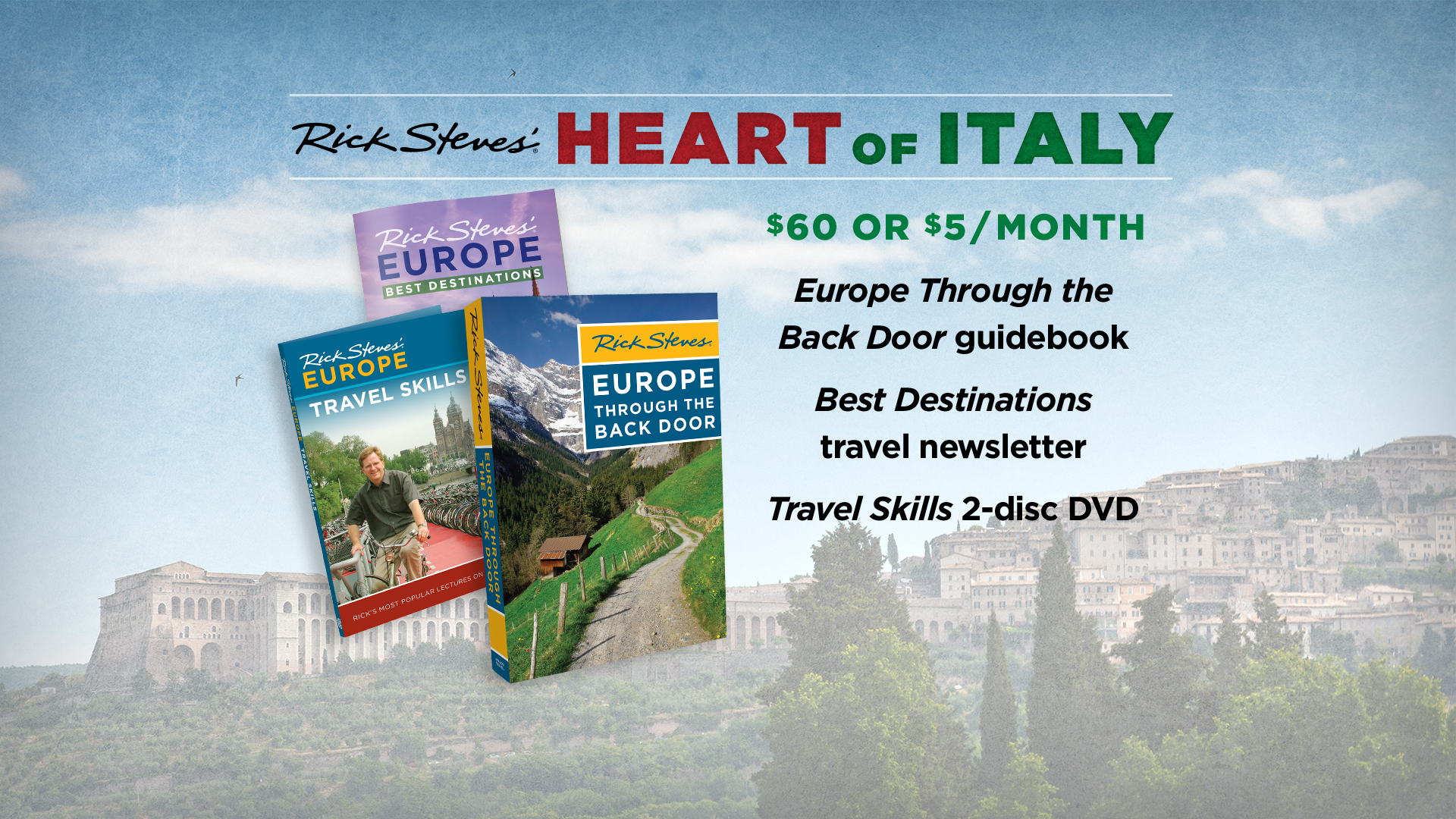 Content: Italy-focused segments from the Rick Steves' Europe television series, interspersed with lively pledge breaks. Available in two lengths: 60 minutes and 120 minutes. Released 2017.