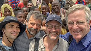 Cameraman Sean White, producer Simon Griffith, cameraman Karel Bauer, and Rick with villagers in Ethiopia. Download image