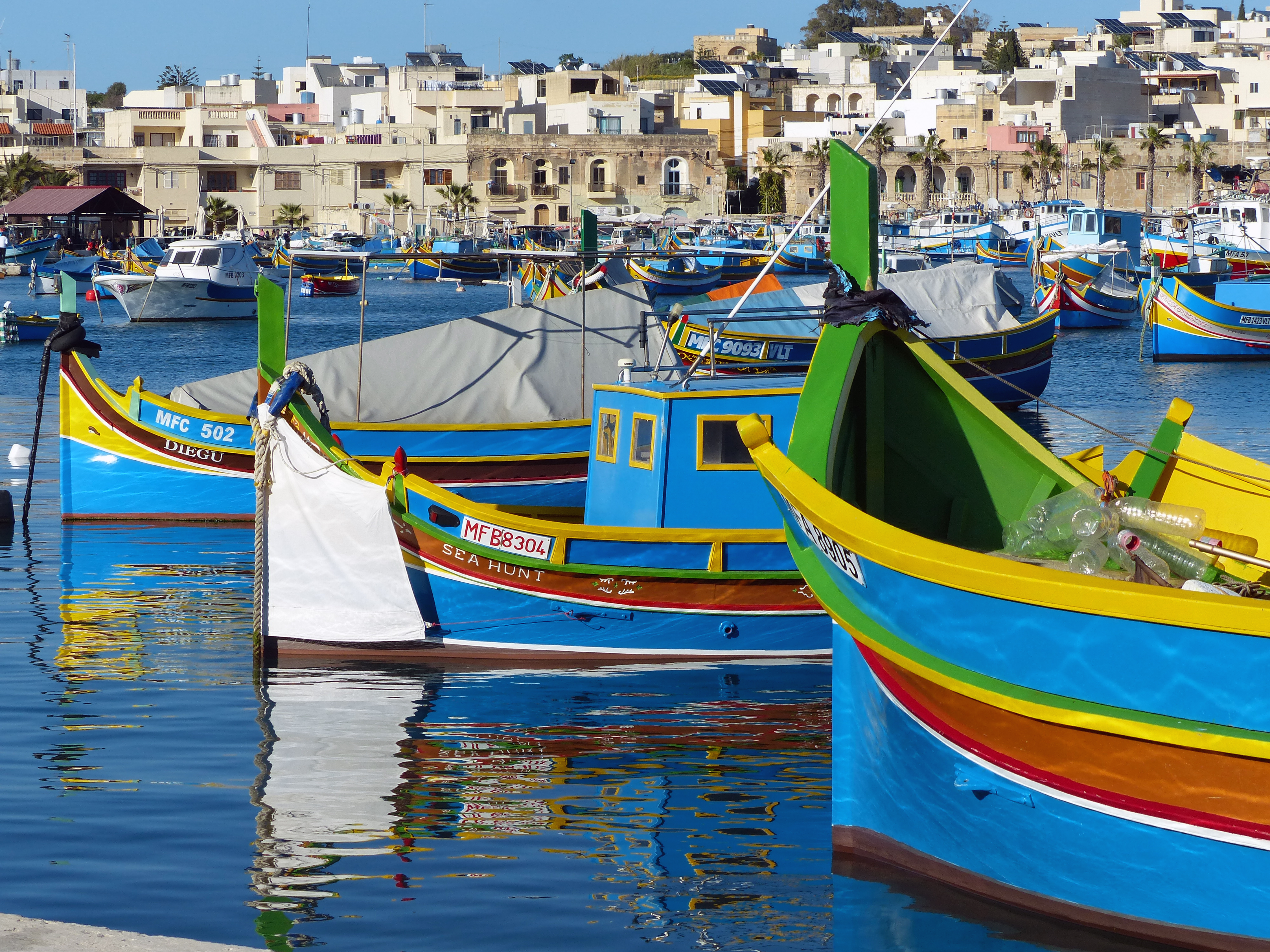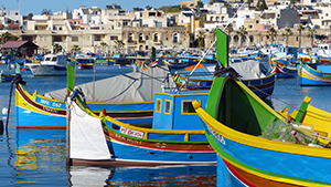 Traditional luzzu fishing boats in Marsaxlokk, Malta. (Photo: Rick Steves' Europe) Download image