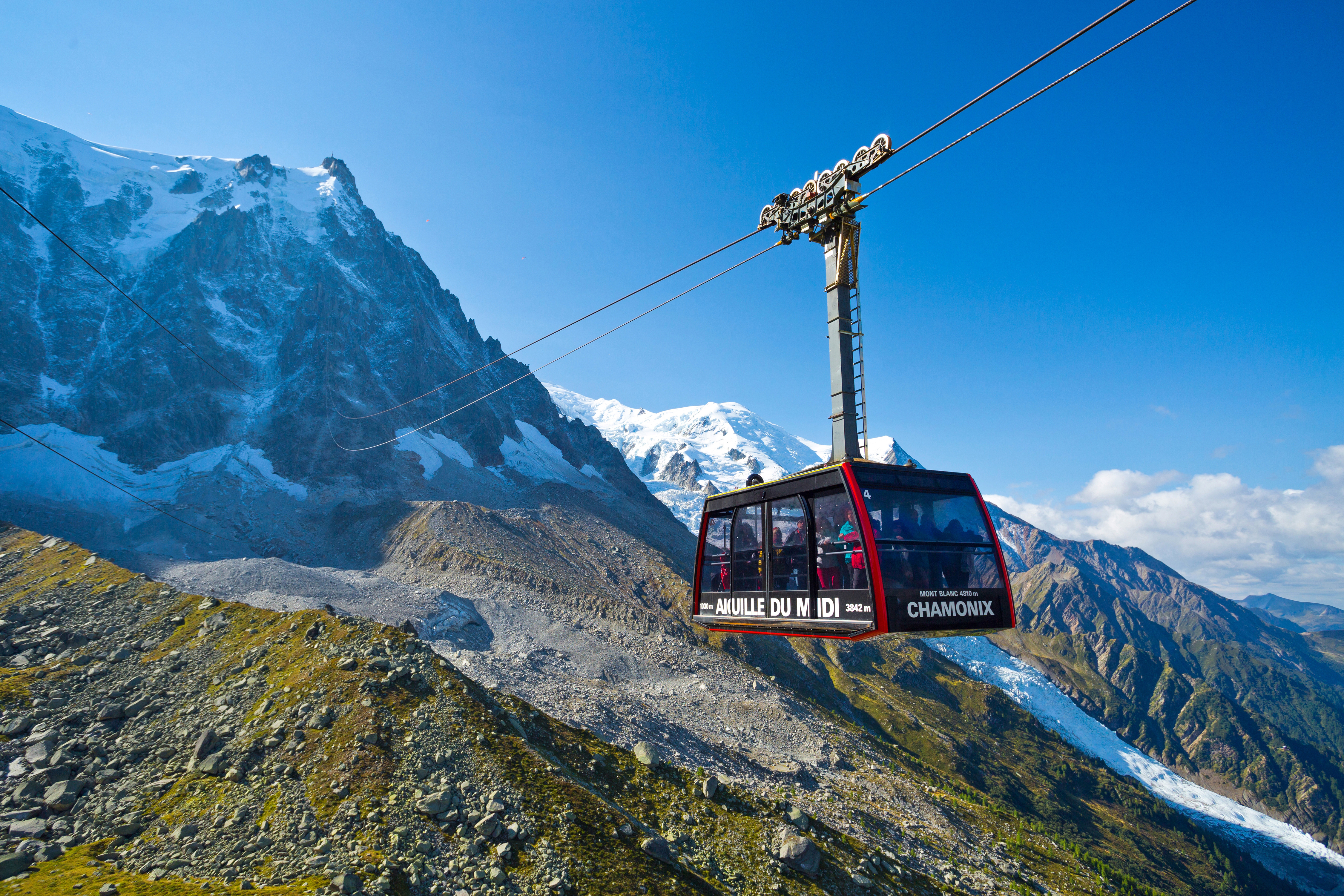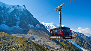 Cable car stretching between Mont Blanc's Aiguille du Midi viewpoint and Chamonix, France. (Photo: Dominic Arizona Bonuccelli)