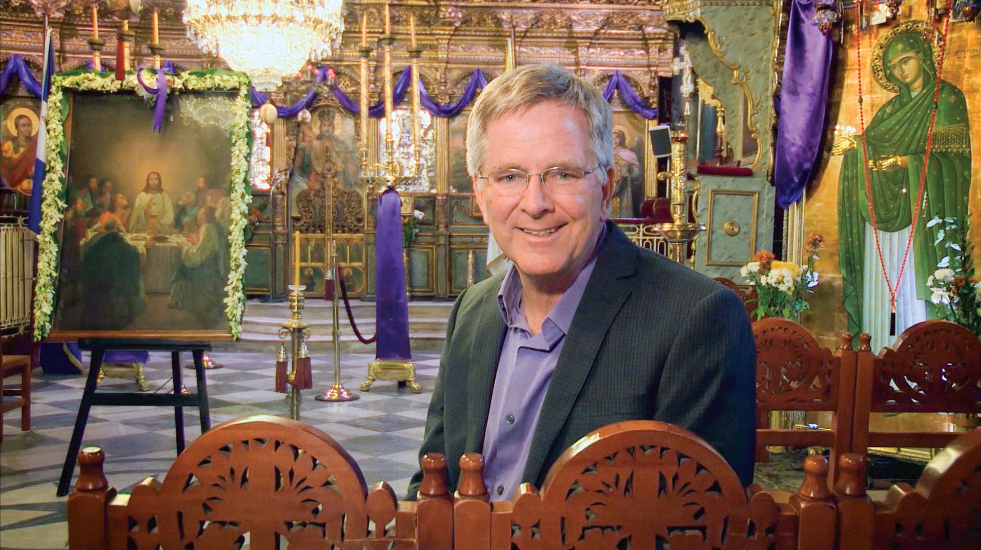 Rick at a Greek Orthodox Church in Nafplio, Greece. Download image.