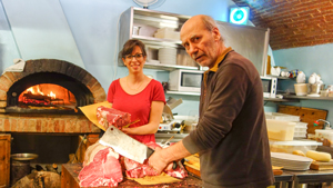 Giulio preparing Chianina beef at Osteria dell’Acquacheta in Montepulciano. Download image