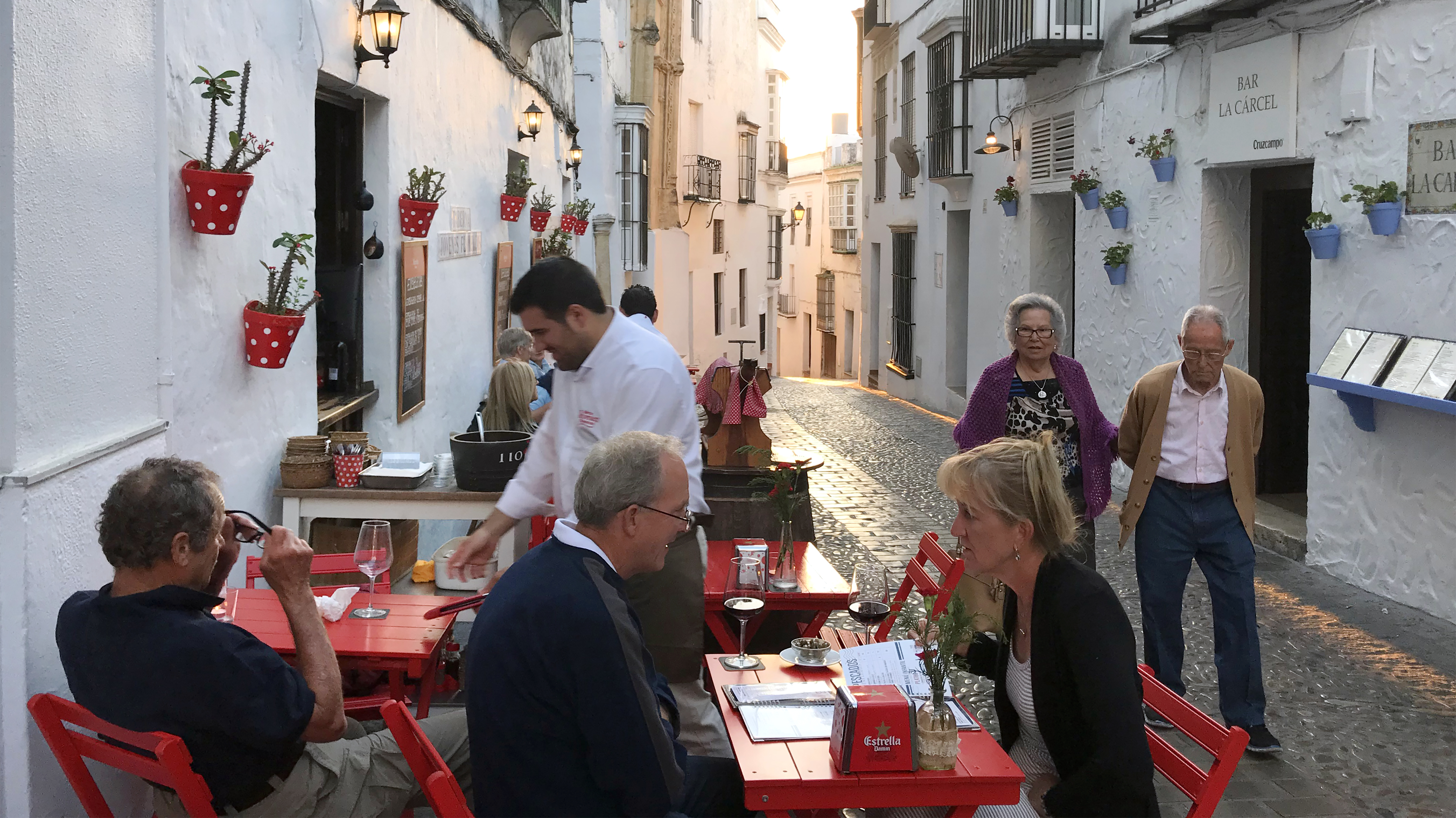 A cobbled street in Arcos de la Frontera serves as an alfresco dining spot. (photo: Rick Steves)