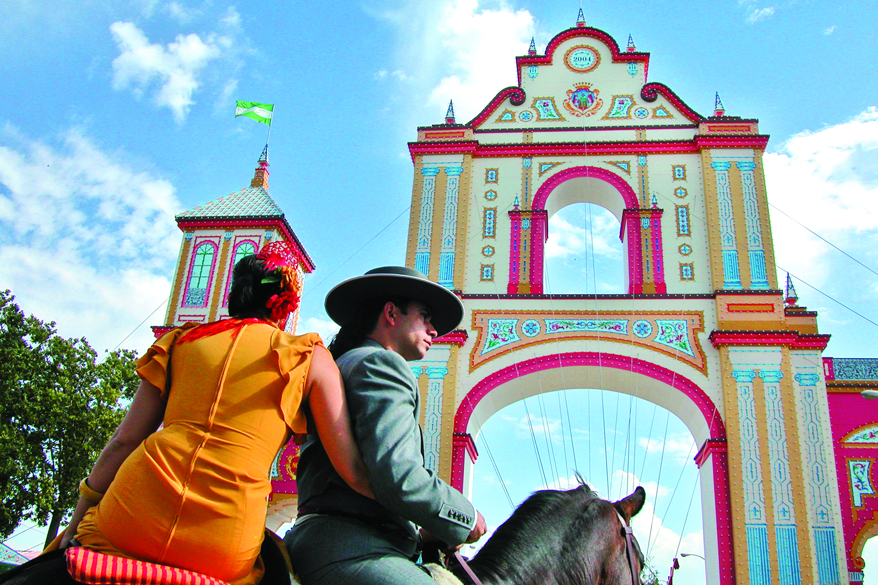 The fair is also Sevilla's peak social event of the year. Women sport outlandish, brightly colored flamenco dresses that would look clownish elsewhere, but are somehow brilliant here. A matching, folding fan completes the look — it's not merely to cool off; it's also a crucial part of flamenco dancing, and can be used to flash coded messages in the flirtation rituals. Men wear the traditional caballero outfit — a short jacket and wide-brimmed hat (though nowadays, many wear business suits and ties or formal wear).
