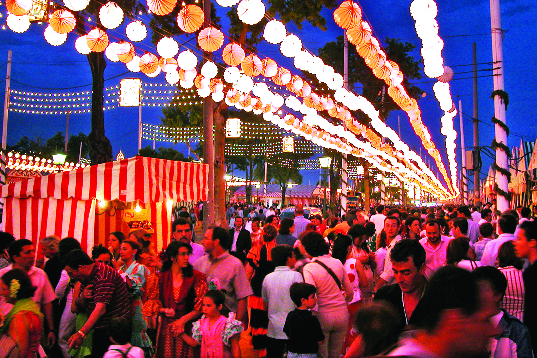 Over a thousand tents, called casetas, pop up in a large fairground across the Guadalquivir River from downtown Sevilla. Each colorfully striped tent hosts a private party for a family, club, or association. Though it's supposed to be a private affair, casual tourists can have a fun and memorable evening by simply crashing the party — it’s not unheard of to strike up an impromptu friendship and be invited in.
