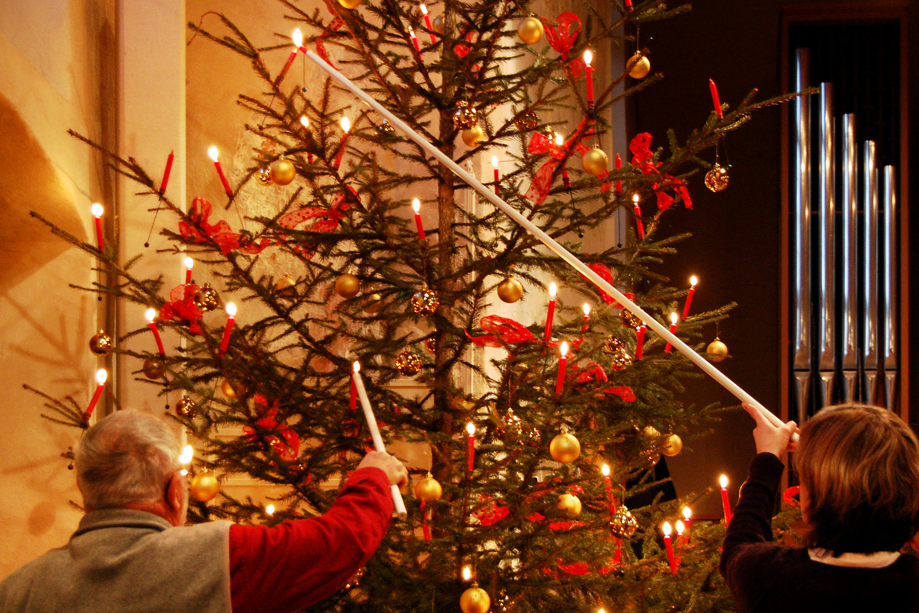 The tree is decorated with real candles, kept upright by dangling ornamental counterbalances, and lit with long tapers. Gimmelwald's pine houses, with open beams, seem ready to go up in flames, but locals are confident. While the candles burn, presents are opened. The tree stays up until after Christmas, as candles are lit all over again on New Year's Eve — for good luck.