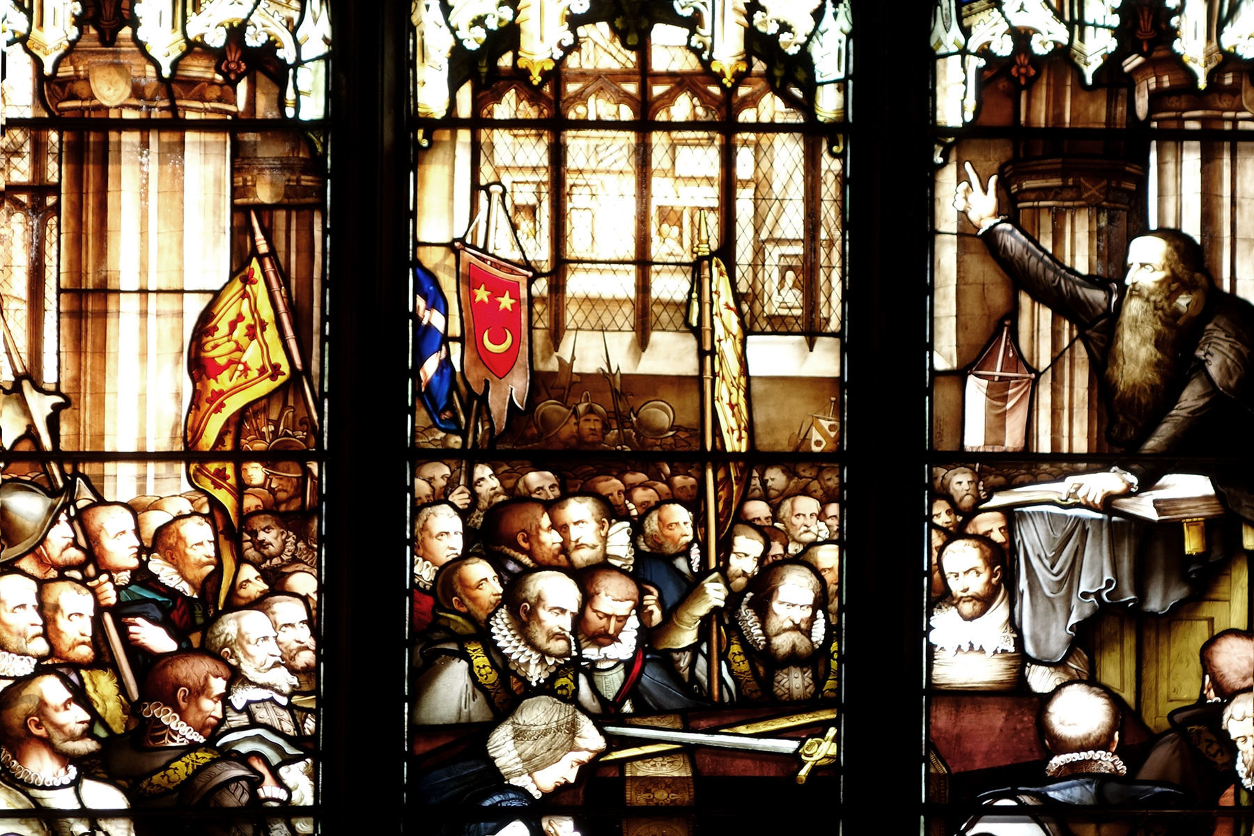 St. Giles' is also the home church of John Knox, whose fiery sermons helped turn once-Catholic Edinburgh into a bastion of Protestantism. Knox's influence was huge. His insistence that every person should be able to read the word of God firsthand helped give Scotland an educational system 300 years ahead of the rest of Europe. A dramatic stained-glass window shows the commotion that surrounded Knox when he preached. With his hand on the holy book, Knox seems to conduct divine electricity to the Scottish faithful packing the church.