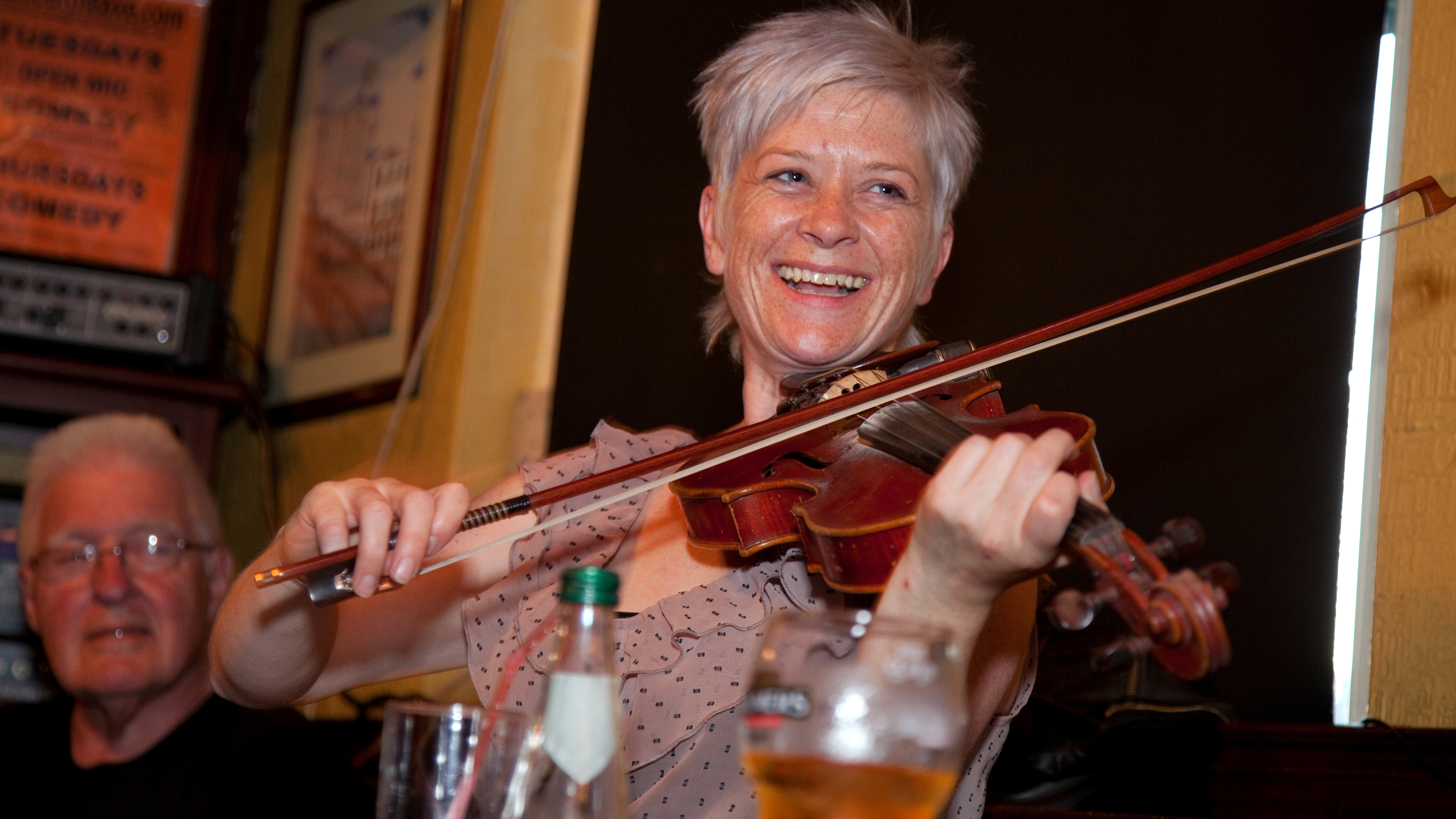 A session can be one of your great Irish experiences — when the chemistry is right, the atmosphere is spellbinding. The music churns intensely while members of the group casually enjoy exploring each other's musical style. The drummer dodges the fiddler's playful bow. Sipping their pints, they skillfully maintain a faint but steady buzz. The floor on the musicians' platform is stomped paint-free, and servers scurry artfully through the commotion, gathering towers of empty, foam-crusted glasses. Make yourself right at home, "playing the boot" (tapping your foot) under the table in time with the music. Talk to your neighbor. Locals often have an almost evangelical interest in explaining the music.