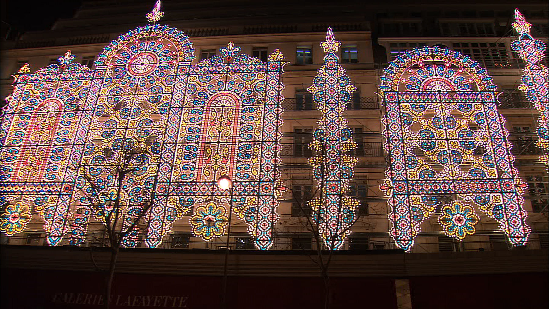 Lick a window. The French phrase for "window shopping" is lèche-vitrine — literally, "window licking." Big department stores compete with one another for the most fabulous window displays of animation and whimsy. French parents dress up their kids and come from all over the country to compare the windows of the three great Parisian department stores: Galeries Lafayette, Printemps, and Bon Marché. The first two stores also have illuminated "canvases" covering their facades with thousands of lights.