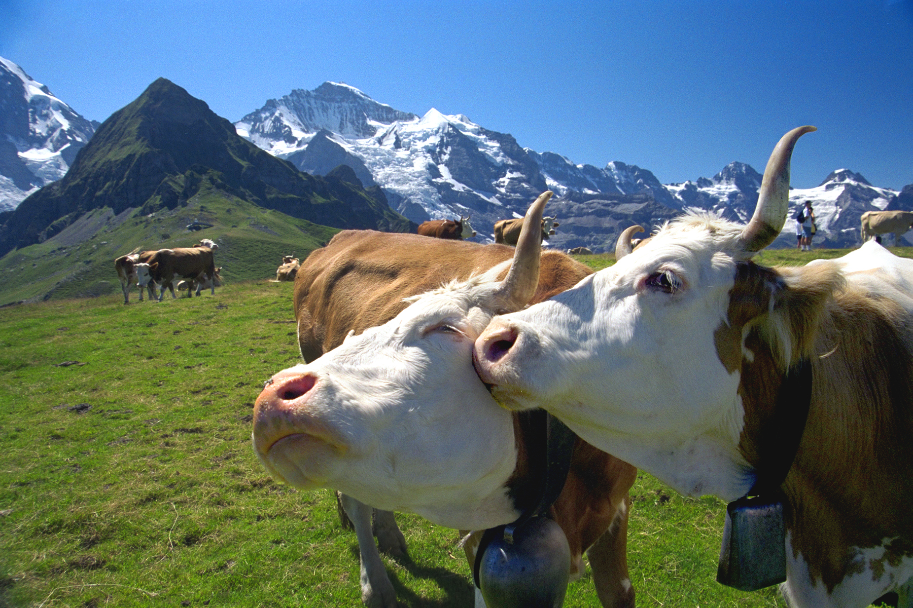 Friendly cows and Jungfrau peak, on the Männlichen–Kleine Scheidegg trail, Berner Oberland, Switzerland