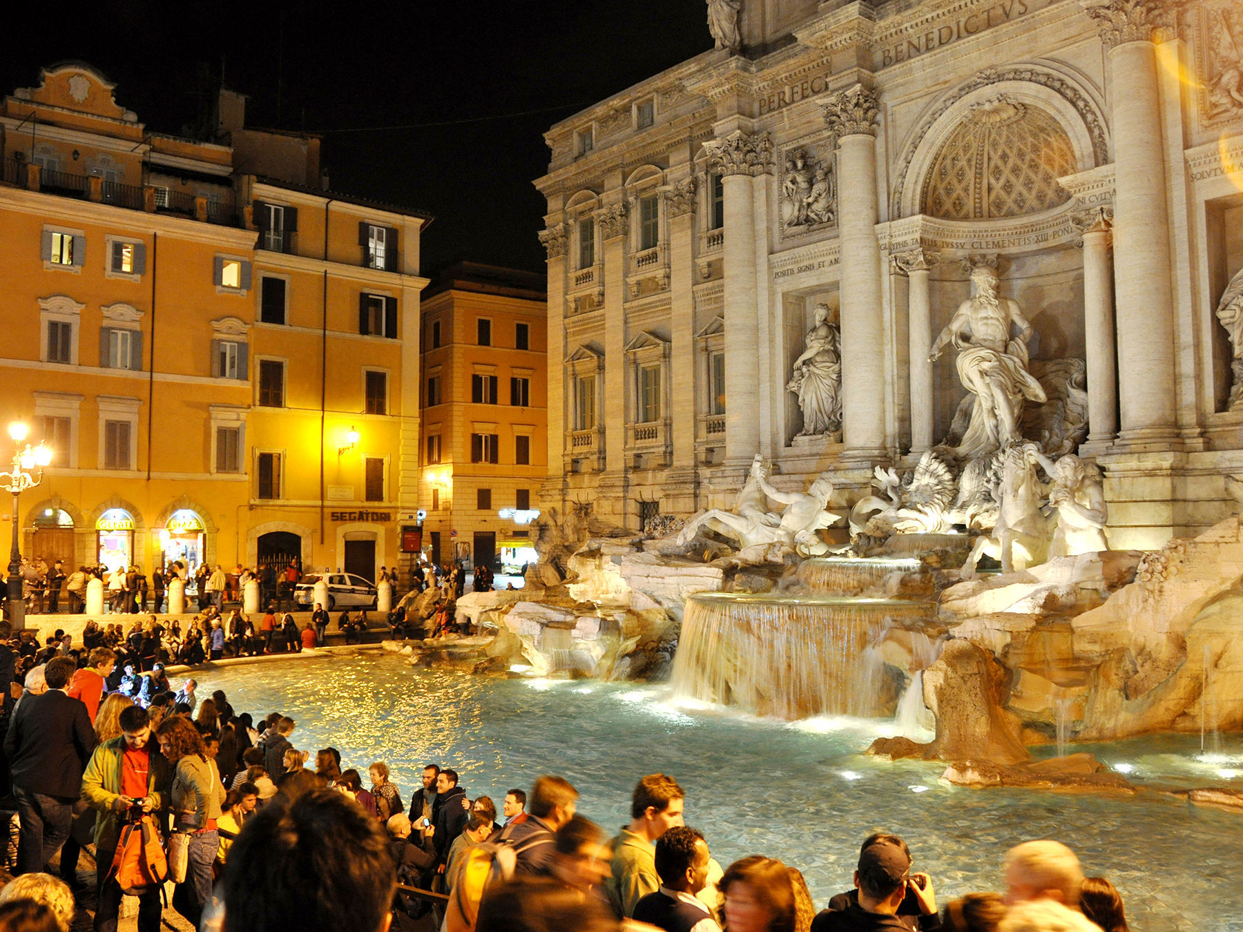 The flamboyance of Bernini's art continued to influence Rome's style even a century later. Rome's iconic Trevi Fountain — dating from the 1700s — is a watery avalanche of Baroque. While the architect who designed it had no inkling of electrical illumination, it seems made-to-order for floodlighting, which heightens the drama. It's said that if you throw a coin into this fountain, you will return to Rome. Every day, tourists test this superstition, trying to ensure their return to this Baroque-filled city. It sounds silly, but I do this every year and it seems to work.