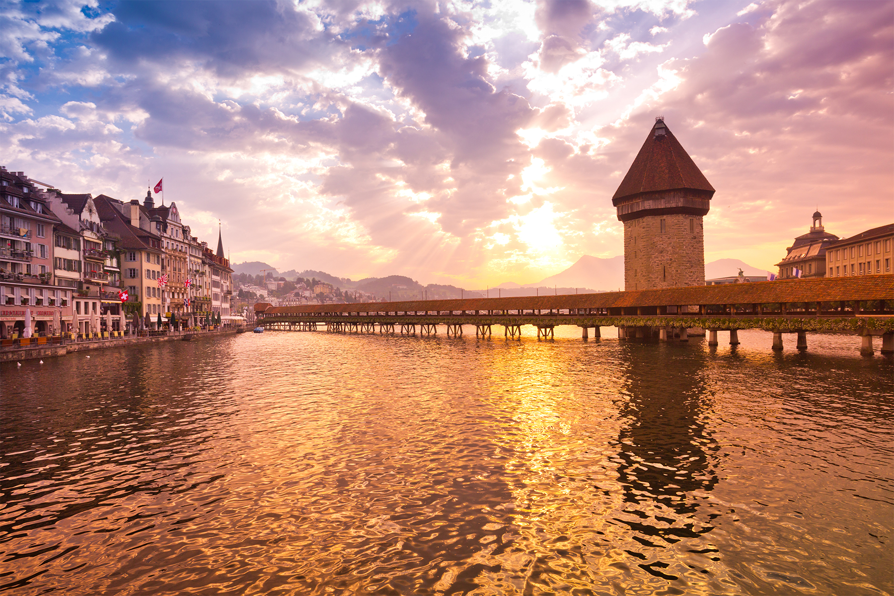 Luzern's Reuss River is spanned by the wooden Chapel Bridge, with its iconic stone water tower. (photo: Dominic Arizona Bonuccelli)