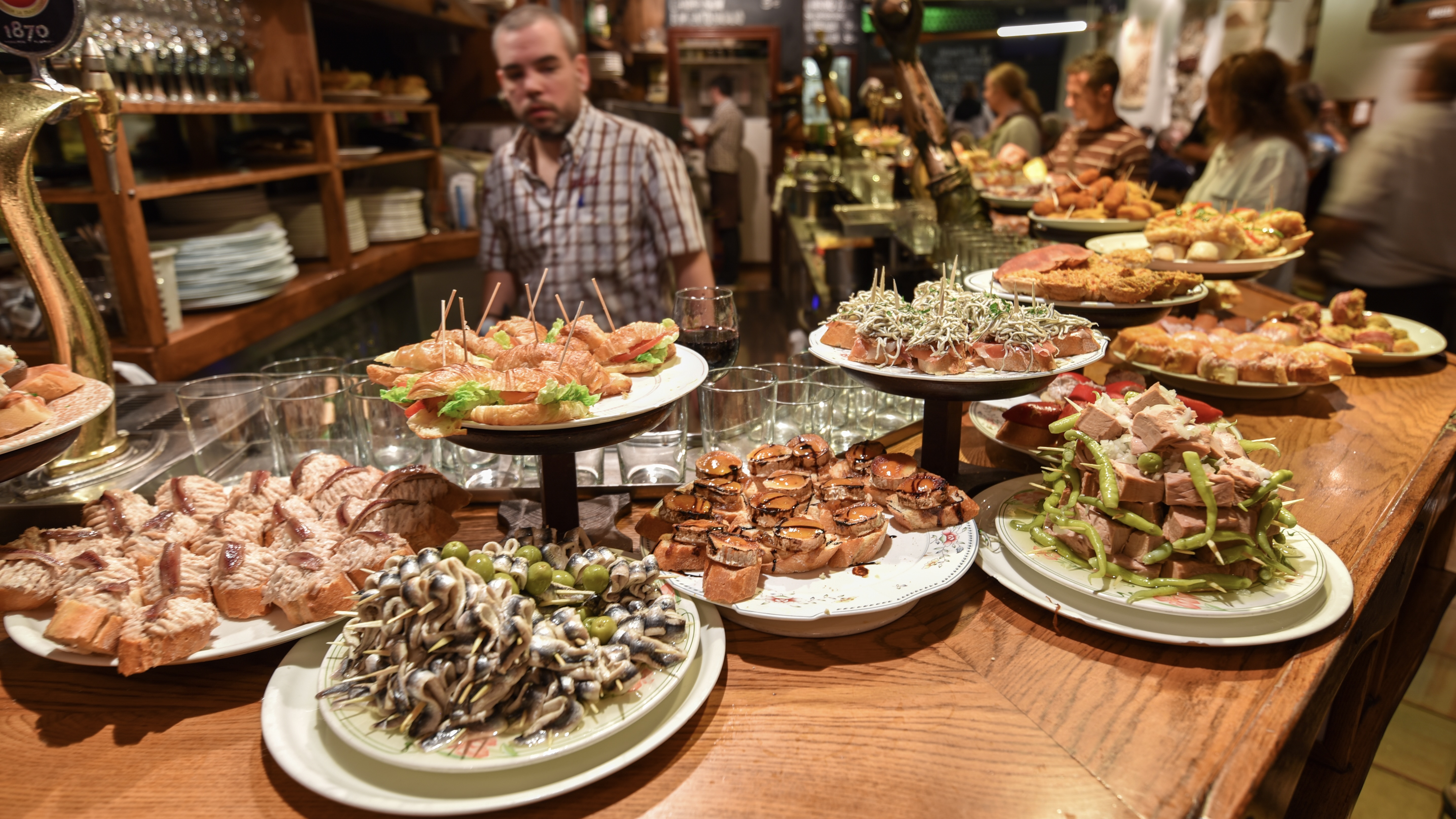 Bar offering plates of pintxos (Basque tapas), San Sebastián
