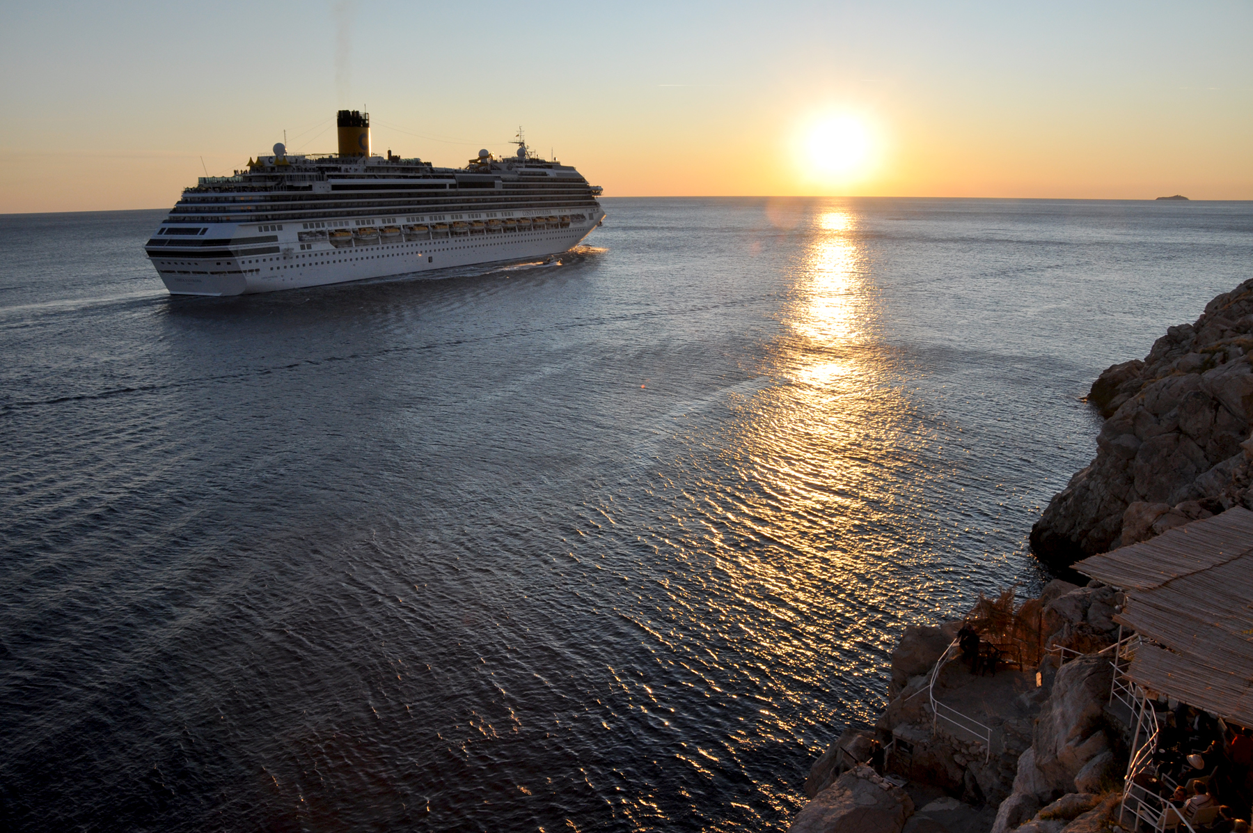 By the time I'm done unpacking, we're far out on the glistening water, so I go up to the main deck. A great thing about cruising is that you really notice the sunset (and, if you happen to be up that early, the sunrise). While standing on the top deck of our ship, what impressed me that first evening was that, of the 5,000 people (tourists and crew) packing that ship, I was all alone under a big twilight sky surveying a vast and lonely Mediterranean seascape.
