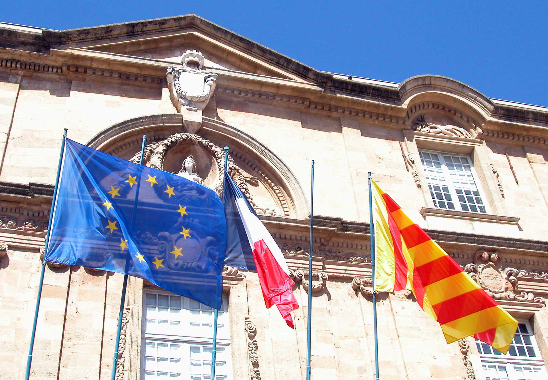 Hôtel de Ville flying flags of Europe, France, and Provence; Aix-en-Provence, France