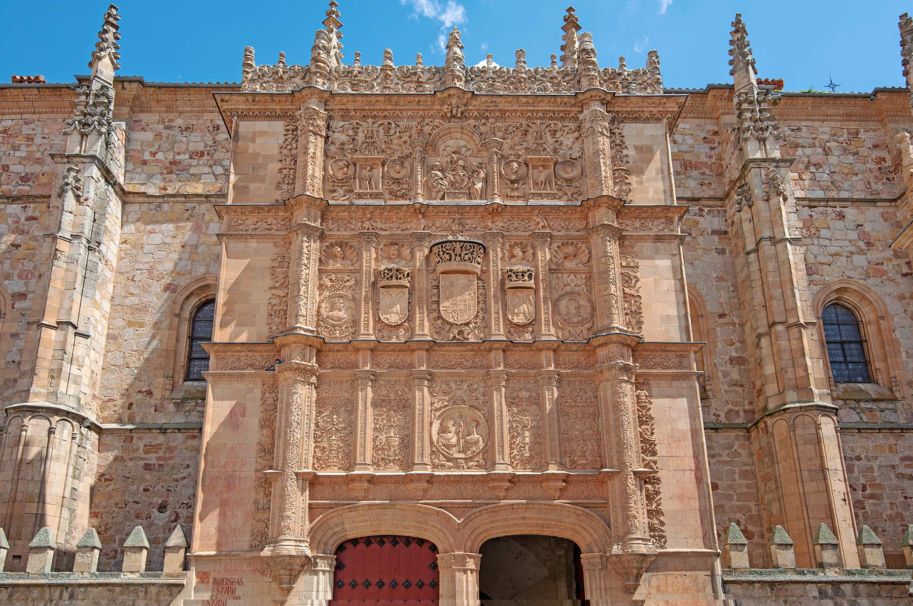 In Salamanca, home to Spain's oldest university (established around 1218), the highlight is the grand facade of the school's entrance. Its intricate stonework is a great example of Spain's Plateresque style, with its delicate, detail-packed, filigree-like carvings, and themes that make subtle statements about intellectual independence from the medieval Church.