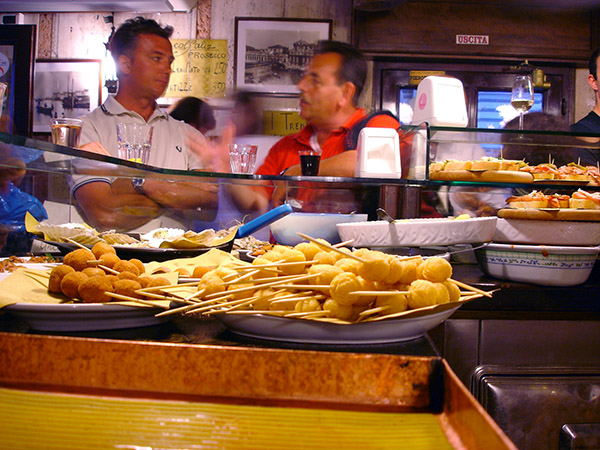 Venice has a wonderful tradition of cicchetti — the local appetizers that line the counters of little pubs all over town at the end of each workday. When in town, my favorite meal is what I call the "Stand-Up Progressive Venetian Pub-Crawl Dinner" — visiting a series of these characteristic hole-in-the-wall pubs, eating ugly-looking morsels on toothpicks, and washing it all down with little glasses of wine. An added advantage is that local characters surround you. And, in a town with canals and no cars, pub-crawling is safe and easy. (Perhaps safer if you know how to swim.)