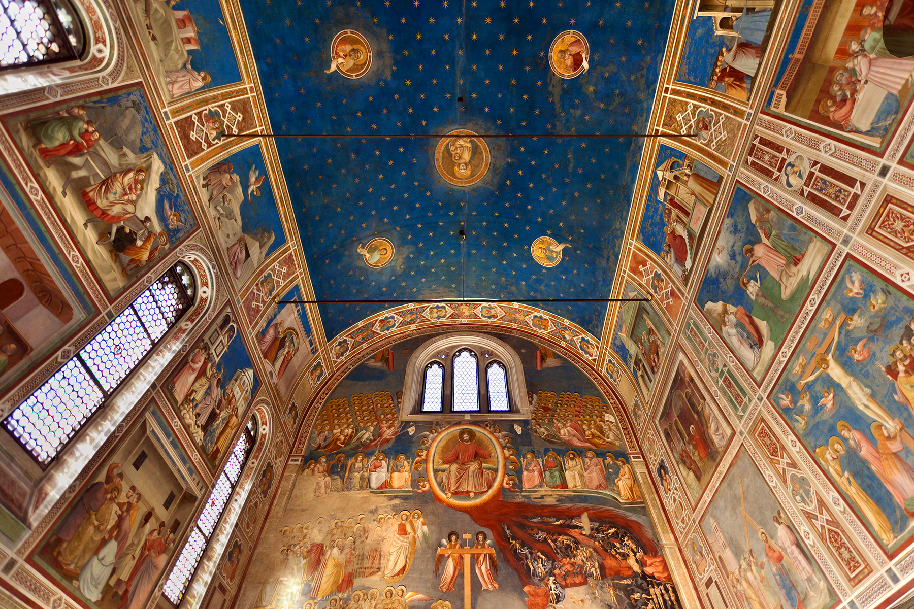 The Scrovegni Chapel is the art treasure of Padua. Nearly every inch of its glorious interior is covered by a cycle of frescoes — all painted by Giotto in the early 1300s, and beautifully preserved. Giotto, considered the first modern painter, produced scenes from the lives of Jesus and Mary that were more realistic and human than anything that had been done for a thousand years. Since the chapel is open only to a limited number of visitors a day, advanced reservations are required.