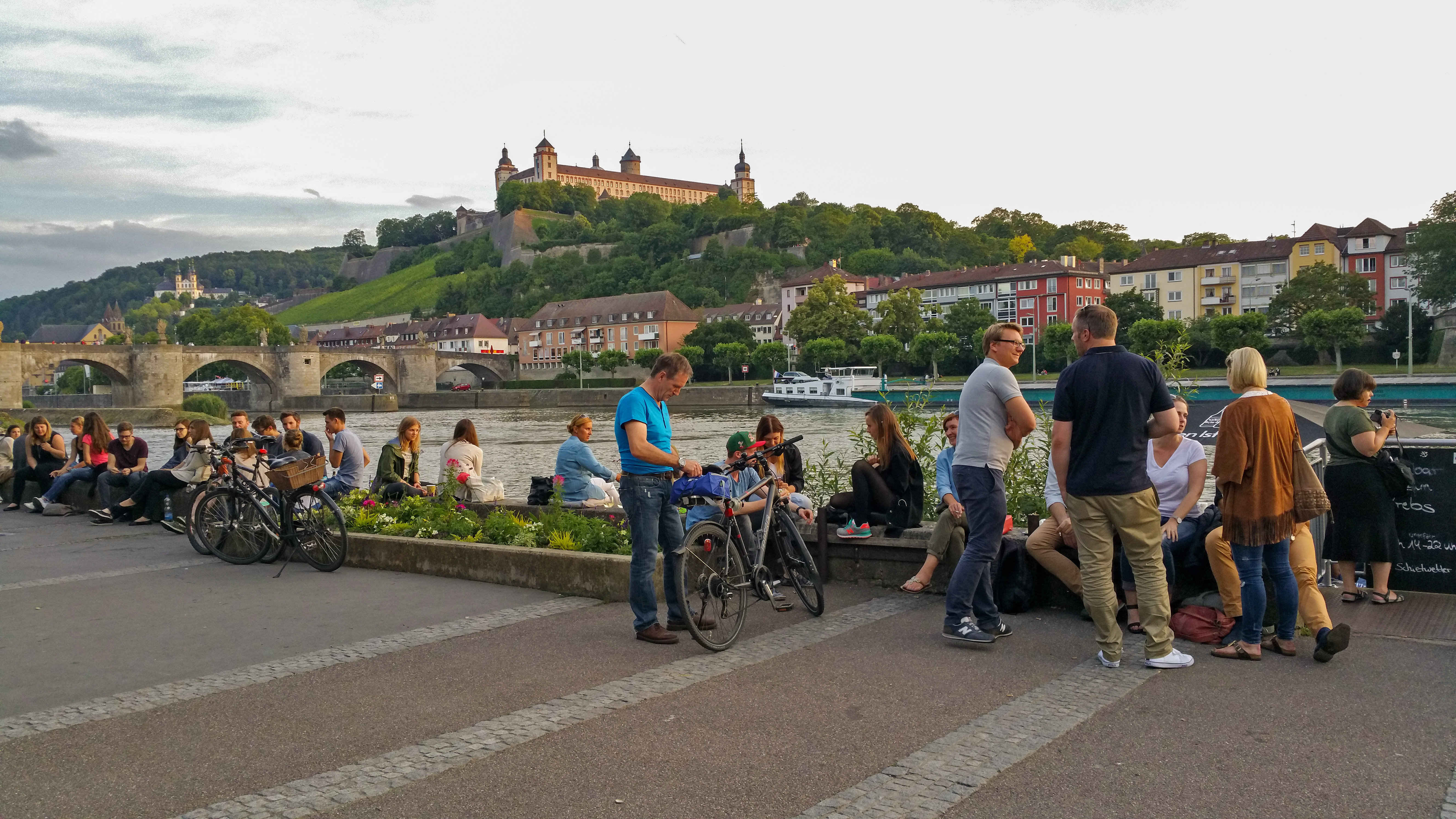 The prince-bishop was as proud of his wine as his fancy palace and chapel. The hillsides around town are blanketed with grapevines — destined to make the famous Stein Franconian wine. Johann Wolfgang von Goethe, the German Shakespeare, ordered 900 liters of this vintage annually. Today, one of Würzburg's loveliest summertime experiences is to enjoy the sunset and a glass of this fine wine with the convivial local crowd that gathers on the old bridge on any warm evening. (The cozy Alte Mainmuehle restaurant, right at the foot of the bridge, sells wine by the glass from a bridge-side window counter.)